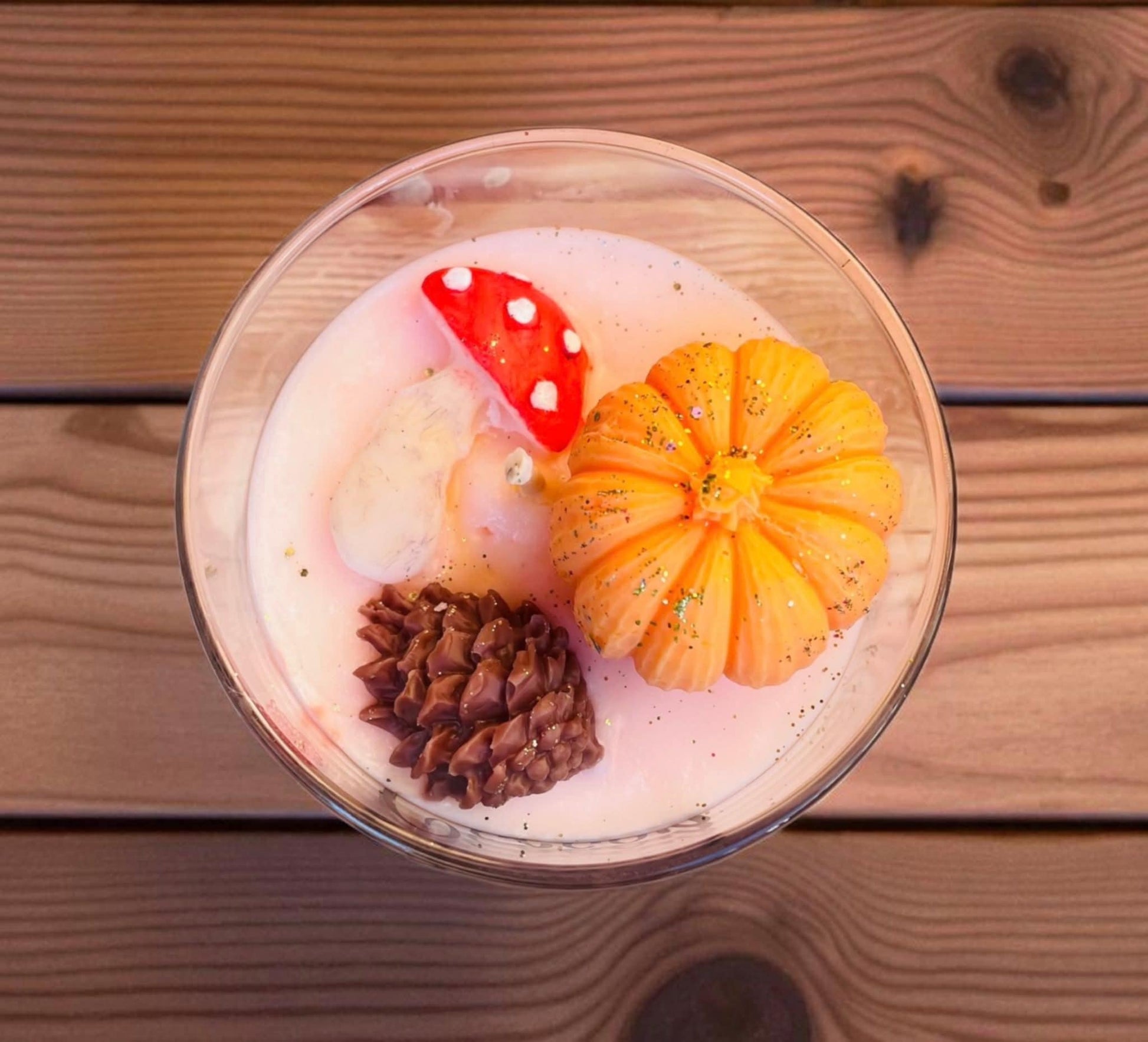 Le décor en cire, composé d’une citrouille miniature, d’un champignon et d’une pomme de pin, ajoute une touche rustique et élégante à cette bougie unique, idéale en décoration comme en diffusion olfactive.